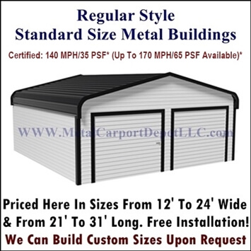 We have a wide selection of Metal Buildings for sale ranging in sizes from 12’-24’ wide and 21’-41’ long. Custom sizes are available with additional lead time. Any custom-sized metal storage building is priced the same as the next size up. For example, if you were to purchase a 22' 6" wide large carport it would be the same price as a 24' wide large carport, and so on.