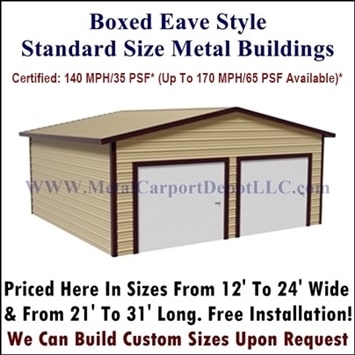 Our enclosed metal garage buildings are available in three styles: Regular Style, Boxed Eave Style, and Vertical Roof Style. Free delivery and installation are included.*