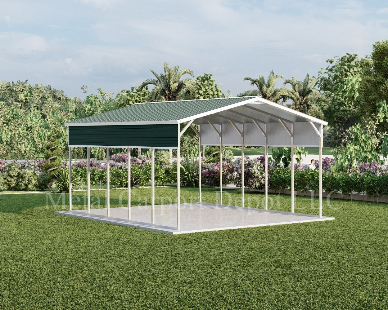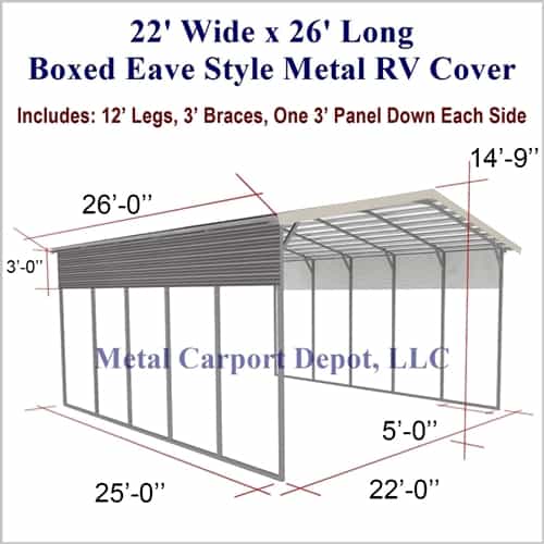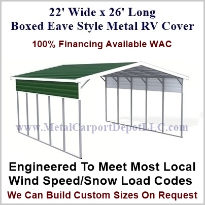 22' x 26' Metal RV Cover (Boxed Eave RV Shelter) With 29 Gauge Horizontal Metal Roof - Free Delivery & Installation!*Price Includes: Certification Package**, 12' Legs, One 3' Brace On Every Leg, One 3' Panel Down Each Side With J-Trim, Rebar Or Concrete Anchors, Legs/Bows 5' On Center, & One Center Brace On Every Bow. Center Height Is 14' 9". On the Boxed Eave Style Metal RV Cover, (A-Frame Type), the RV Cover comes with the Standard Horizontal Roof. The Roof Panels run parallel to the side of the Structure. Water will drain to the front or the back of the Structure. On this style you have the option of having the roof panels Boxed Eave Style with the Vertical Roof for an additional charge. We recommend the Vertical Roof Style for the small difference in price versus the Horizontal Roof Style. We highly recommend any Metal Structure longer than 31 feet be upgraded to the Vertical Roof Style to avoid any potential leaks at the seams. You may also want to order this style to more closed resemble other buildings on your property. We also offer a variety of options with our Boxed Eave Style Metal RV Covers. You should consider purchasing an Extended Gable End for the back of your RV Cover. It makes the RV Cover stronger & it comes down even to the 3 Ft. Side Panels to keep the Blowing Rain off the back of your RV. You can also add Helical Ground Anchors, Close One End and/or the Sides To The Ground, & More While Ordering. Select from 13 Color Choices for the Roof, Side Panel, & Trim Colors. We can also build Custom Configurations according to your Needs & Specifications, Including Specific Widths & Lengths. We offer standard size Metal RV Cover (Boxed Eave RV Shelter), to save you time & money. They are priced 12' wide, 18' wide, 20' wide, 22' wide, & 24' wide, & in lengths they are priced 26' long, 31' long, & 36' long. We can build any custom size in between these sizes. Any custom size is priced the same as the next size up. I.e. a 21' wide is priced the same as a 22' wide, a 24' long would be priced the same as a 26' long, etc. Why Pay Storage Fees? We Have Partnered With Major Lenders To Provide 100% Financing With Competitive Rates. View finance offers online. Free Credit Score. Compare Offers From Top Lenders! Less Than Perfect Credit? Credit Approvals With FICOs AS Low As 600!