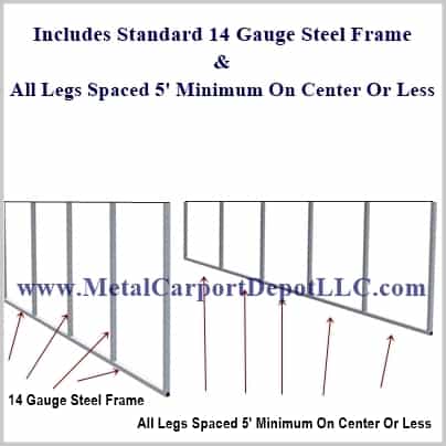 Price Includes: Certification Package**, 26' Long Roof - 25' Long Frame, 12' Legs, One 3' Panel Down Each Side With J-Trim 14 Gauge Galvanized Frame, Rebar or Concrete Anchors, All Legs/Bows 5' On Center, All Required Leg Bracing, & Center Brace On Every Bow. Center Height 14' 9".