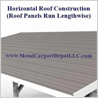 On the Regular Style and the Boxed Eave Style the standard way the roof panels are installed is horizontally. When the roof panels are installed horizontally, the ridges of the steel panels run parallel to the sides and top ridge of the structure. Water, snow, etc., will drain to the front and back of the structure, and may tend to pond on the roof. The maximum length of a horizontal panel is 31'. Any structure over 31' in length will have two horizontal panels seamed together at some place. On the Boxed Eave Style the roof panels can be installed vertically for an additional charge. On the Box Eave Style with the roof panels installed vertically, the ridges of the roof panels run from the top ridge of the structure to the sides, and has "Purlins", (an additional frame running lengthwise), to attach the vertical roof panels to. This roof configuration displaces water, snow, etc., much more efficiently and water will not pond on the roof. We strongly recommends the vertical roof on all structures over 31'. Vertical Roof Structures could be up to one foot shorter than specified length.